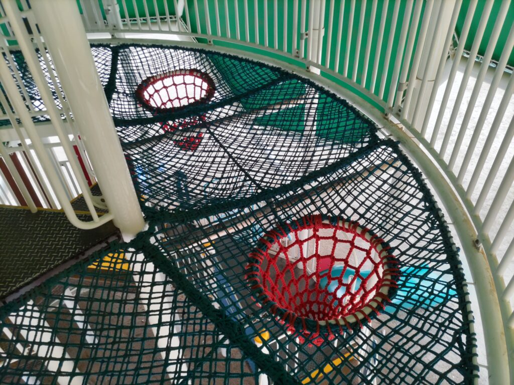 中の階段を一番上まで行きますと、左側にはロープのネットの上をフワフワ歩く