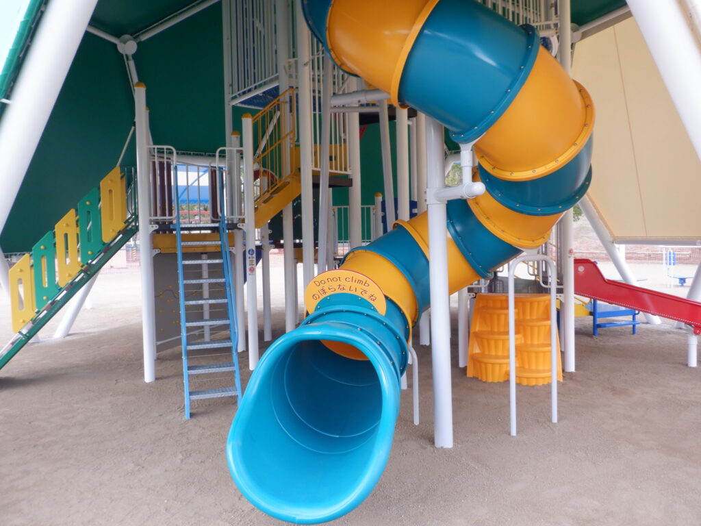 スパイラルチューブスライダーは、中で1回転しながら降りてくるので子供たちに人気のです。